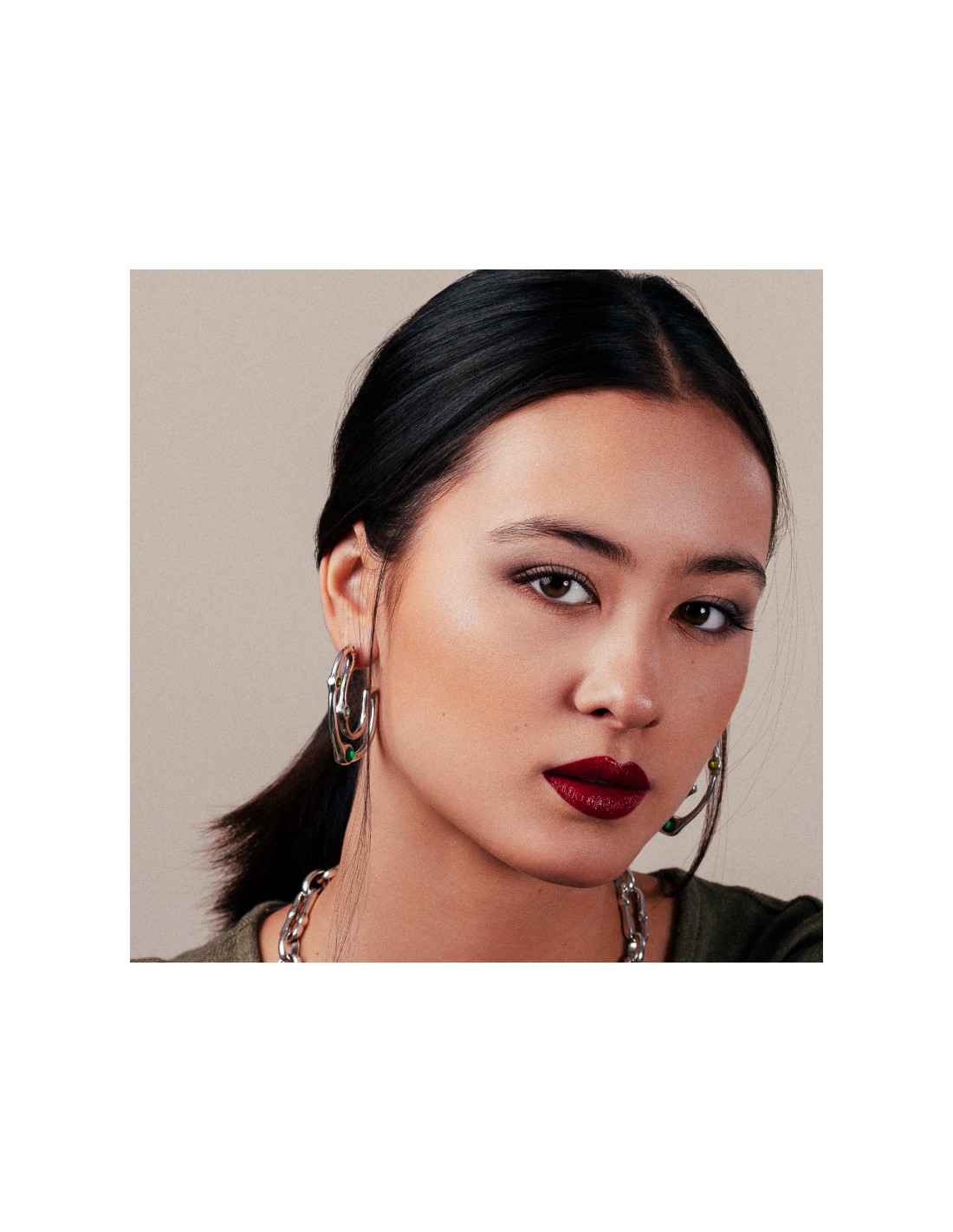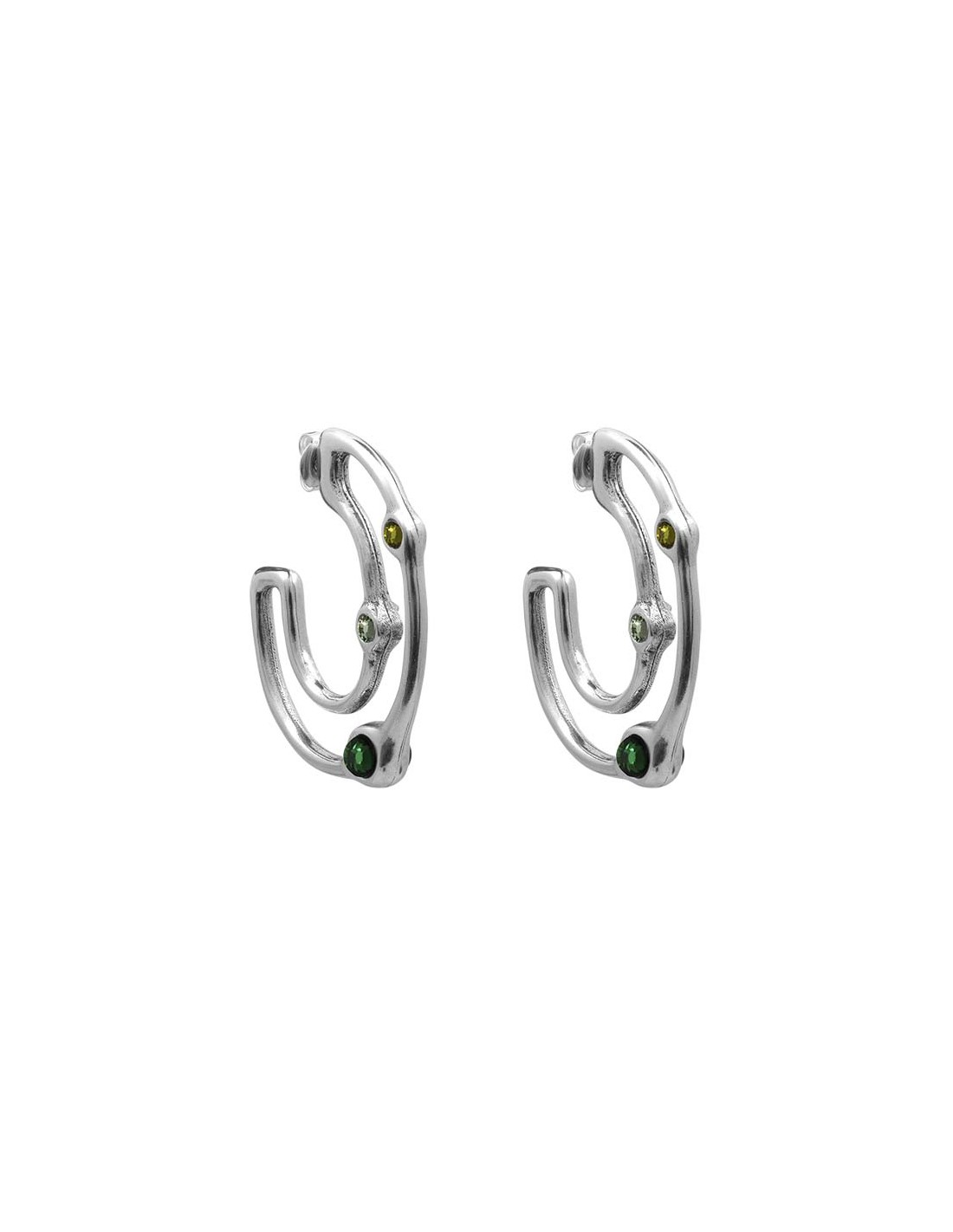 Pendientes Akina bañados en plata de la Colección Saori inspirada en la filosofía Feng Shui. Diseño con motivo de planta de Bambú en foma de aros decorados con cristales de Murano con acabado perlado. Disponibles en 4 combiciones de color. Miden 35x45 mm. Cierre a presión.