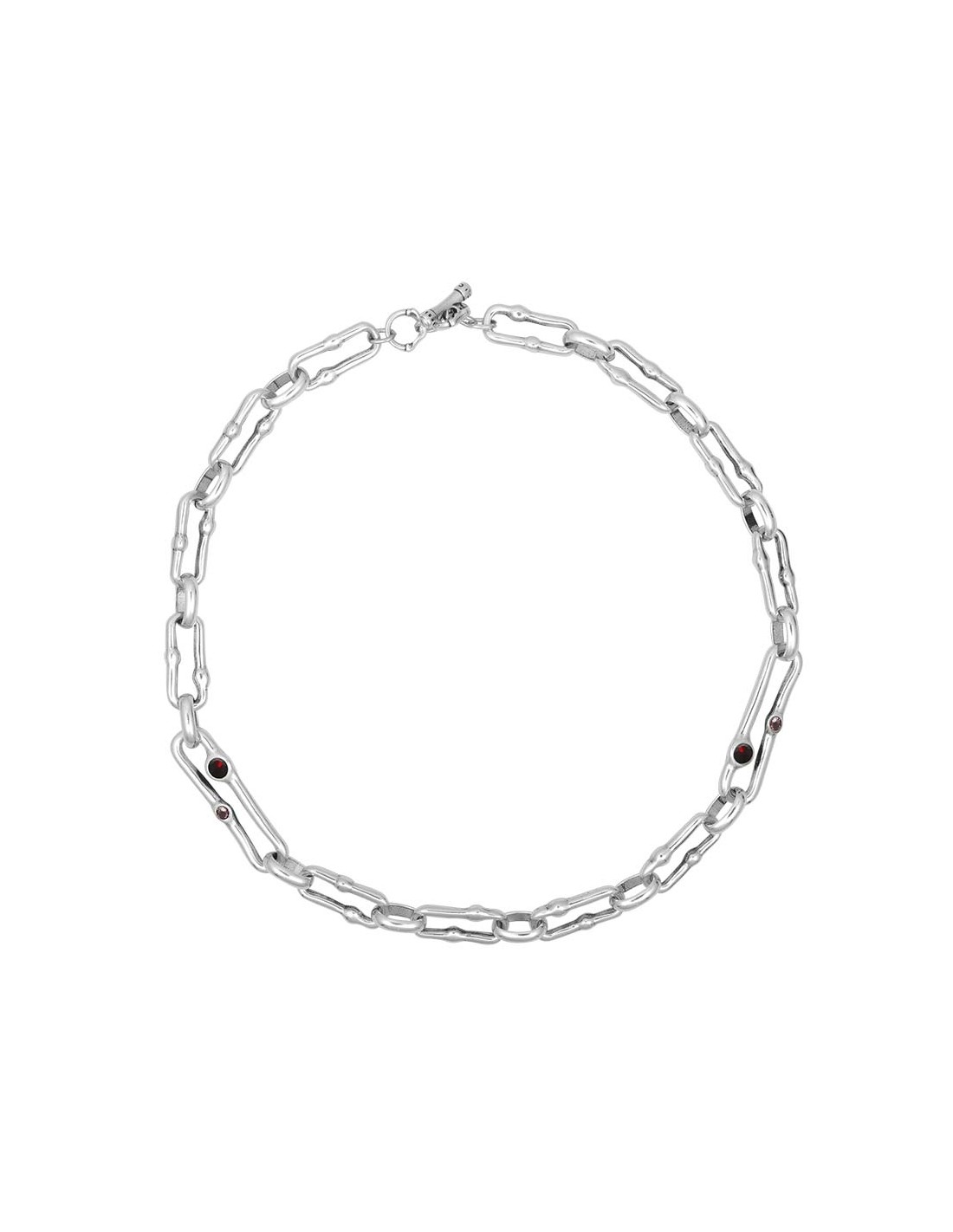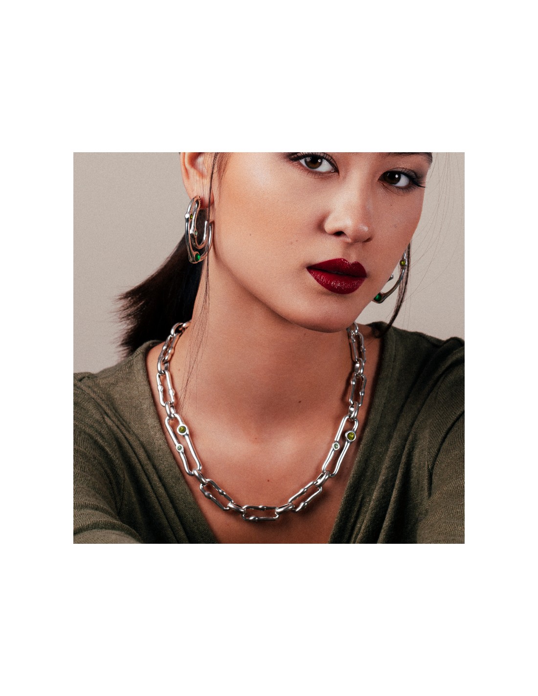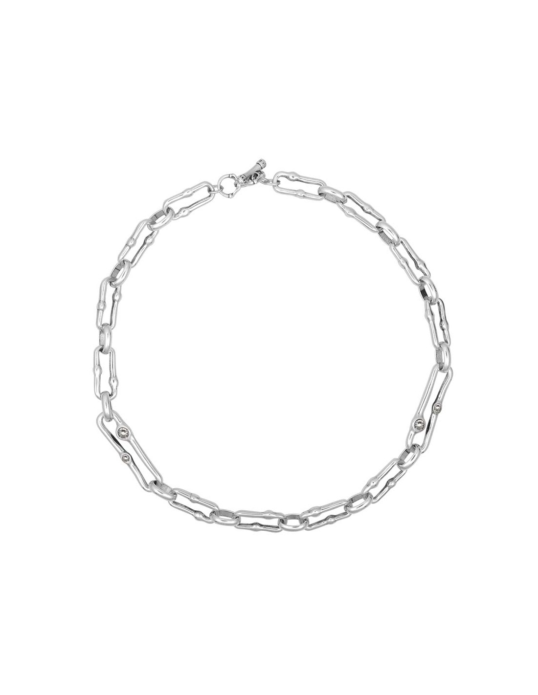Collar Azami corto combinado bañado en plata de la Colección Saori inspirada en la filosofía Feng Shui. Eslabones con diseño de planta de Bambú decorados con cristales de Murano con acabado perlado. Disponible en 4 combinaciones de color. Mide de 47 a 49 cm.