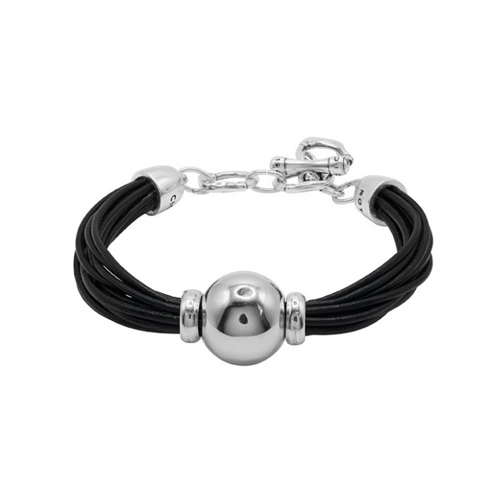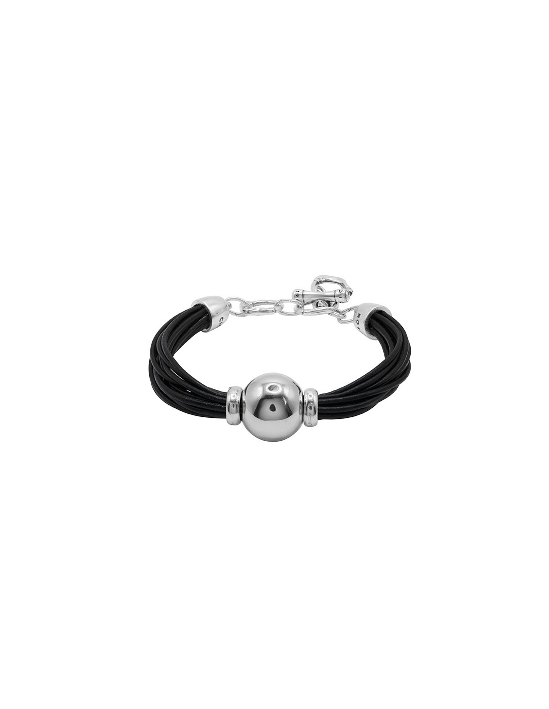 Le bracelet Juno est composé de plusieurs cordons de cuir fins qui traversent une sphère centrale en argent plaqué, créant un design linéaire et élégant. Son fermoir en forme de T permet de le régler entre 17 et 21cm, ce qui en fait un bijou polyvalent et contemporain, parfait pour compléter tous vos looks.