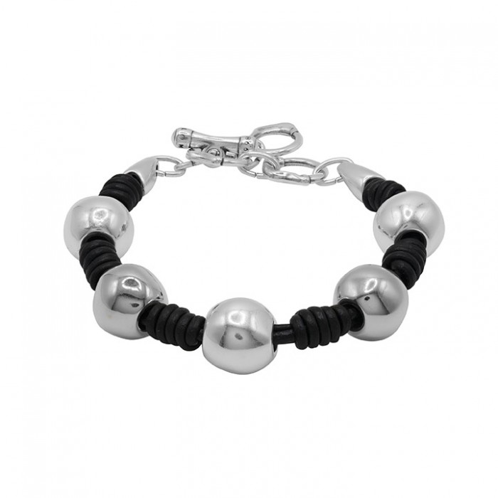 Le bracelet Casiopea en cuir est décoré de grosses sphères en argent plaqué, entrecoupées de nœuds qui apportent de la texture et du style au design. Son fermoir en T permet de de le régler de 17 à 21 cm, ce qui en fait un accessoire polyvalent et contemporain, parfait pour tous vos looks.