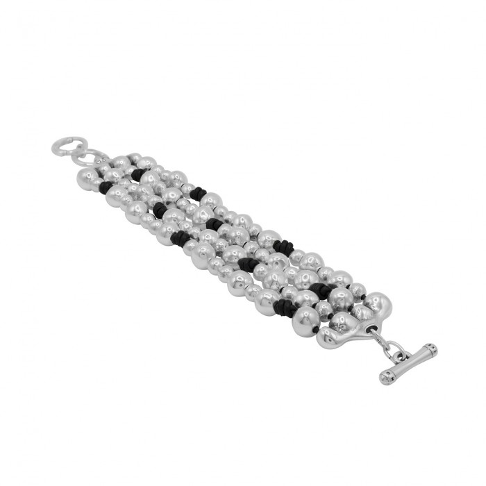 Le bracelet Nereida est un bracelet large de 3cm qui entremêle du cuir avec des nœuds et des petites sphères plaquées argent. Ses sphères, disponibles en deux tailles, créent un jeu de volumes qui lui confère du caractère et une grande originalité. Avec son fermoir en T et sa taille réglable de 17 à 21 cm, ce bracelet est conçu pour se démarquer et devenir la pièce maîtresse de votre style.