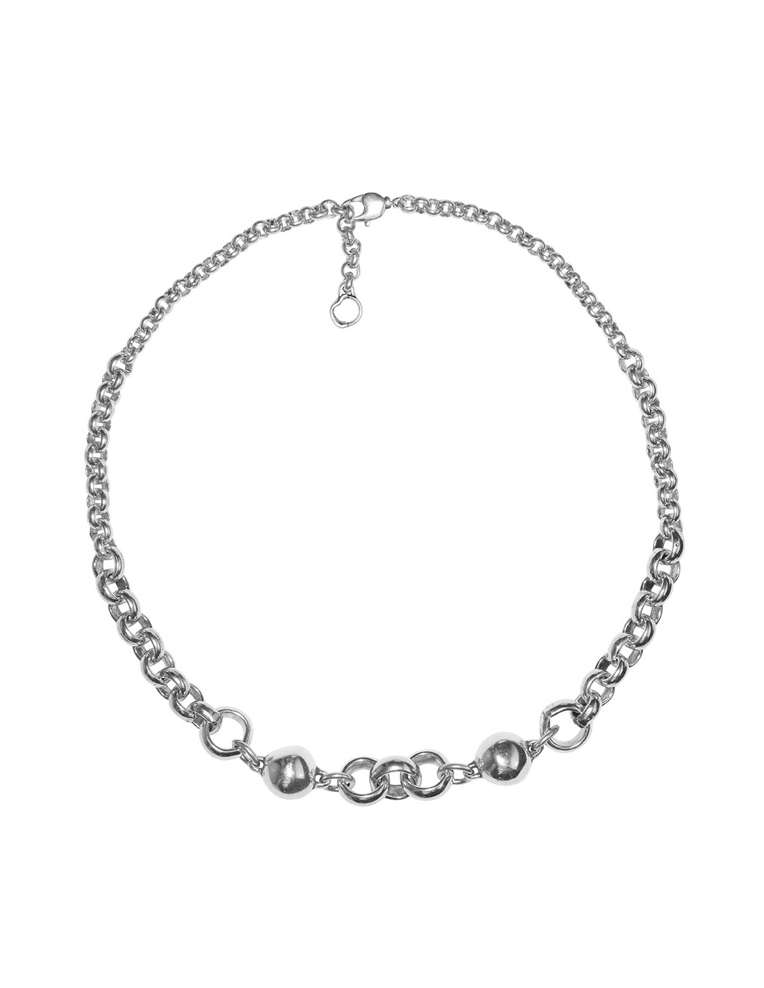 Le collier Sirio combine des fragments de chaînes à maillons de différentes tailles et des sphères plaquées argent, créant ainsi un design élégant et plein de mouvement.