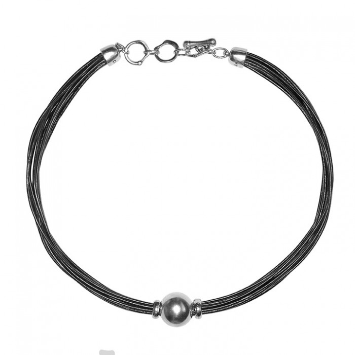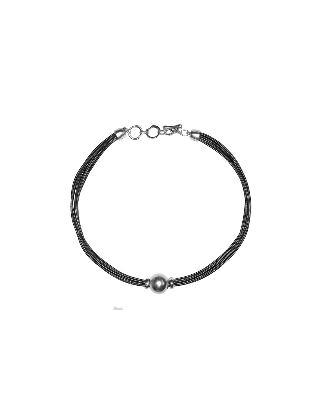 Le collier Juno combine un bain d'argent et plusieurs cuirs de différentes épaisseurs qui passent par une sphère centrale, un design élégant et polyvalent.