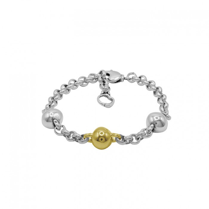 Bracelet à chaîne en maillons plaqué argent, composé de deux sphères plaquées argent et d'une sphère centrale plaquée or qui apporte contraste et luminosité. Son fermoir à mousqueton permet un réglage confortable de 17 cm à 21 cm, s'adaptant ainsi à différents styles et poignets. Un bijou polyvalent qui allie classicisme et modernité, idéal à porter seul ou à associer avec d'autres bracelets de la collection.
