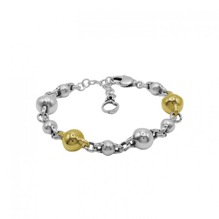 Le bracelet Biela Or est conçu avec une chaîne à sphères de deux tailles différentes, alternant entre un placage en argent et en or pour créer un contraste équilibré et contemporain. Son fermoir à mousqueton permet de le régler de 17 à 21 cm, pour une mesure parfaite. Un bijou polyvalent qui joue avec la lumière et les volumes, idéal à porter seul ou en combinaison avec d'autres pièces.