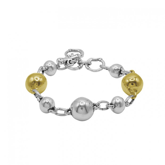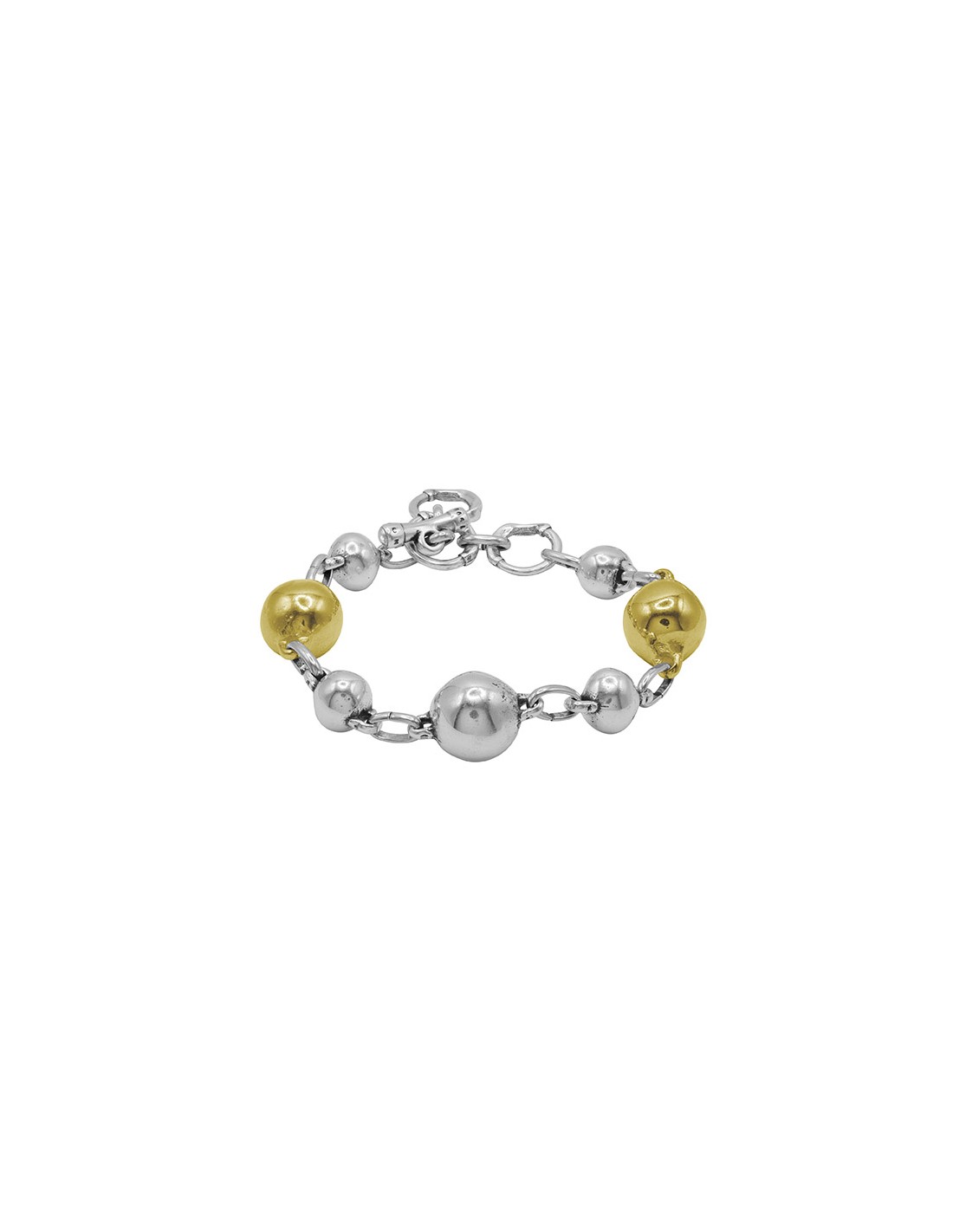 Bracelet Perseidas Or avec chaîne à sphères de deux tailles, plaquées argent et or pour créer un contraste élégant et plein de mouvement. Son motif à sphères rappelle la luminosité des étoiles, créant ainsi un design polyvalent et intemporel. Grâce à son fermoir à mousqueton, il s'ajuste confortablement de 17 cm à 21 cm, s'adaptant à tous les poignets.