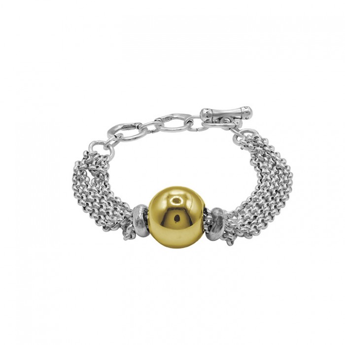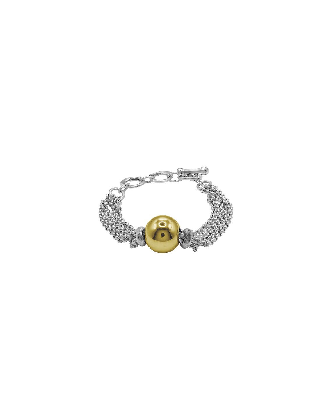 Le bracelet Spherik Or plaqué argent est composé de plusieurs chaînes fines qui traversent une sphère centrale plaquée or. Le contraste entre les deux finitions apporte dynamisme, lumière et style contemporain. Son fermoir en forme de T permet de l'ajuster confortablement de 17 à 21 cm. Un bijou polyvalent et sophistiqué, idéal pour apporter une touche originale à tous vos looks.