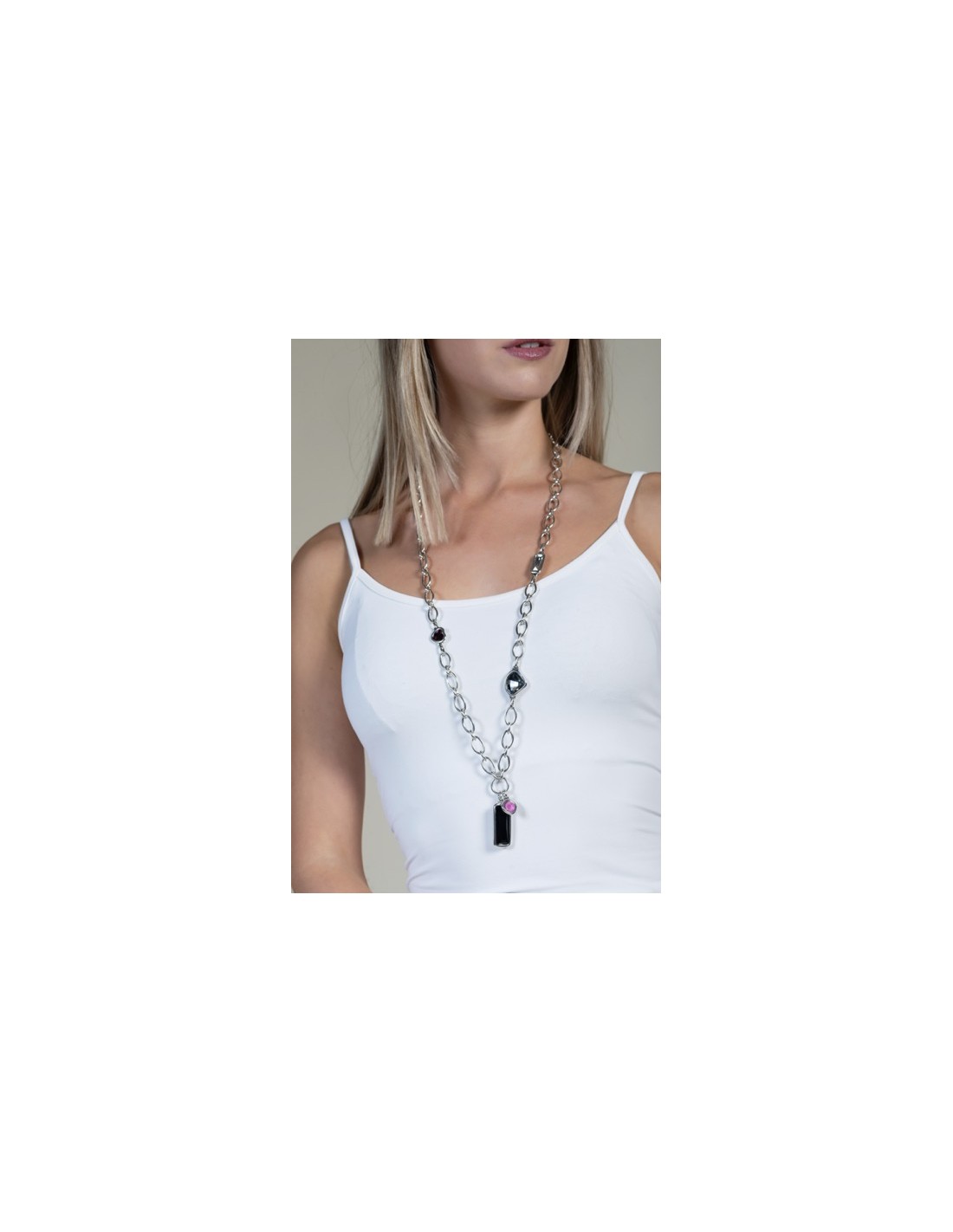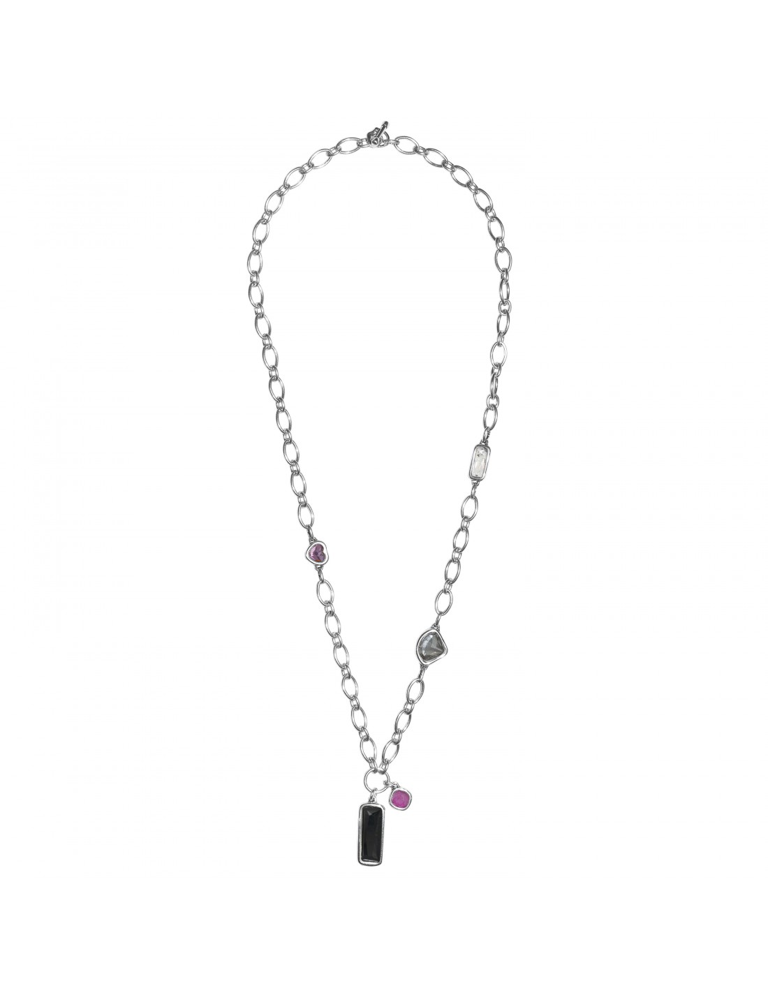 Le collier Multiforme, long et plaqué argent, associe charms et pierres facettées bicolores. Fabriqué à la main à Madrid, 80 cm de long avec fermoir en T, il apporte mouvement, brillance et style contemporain à votre tenue.