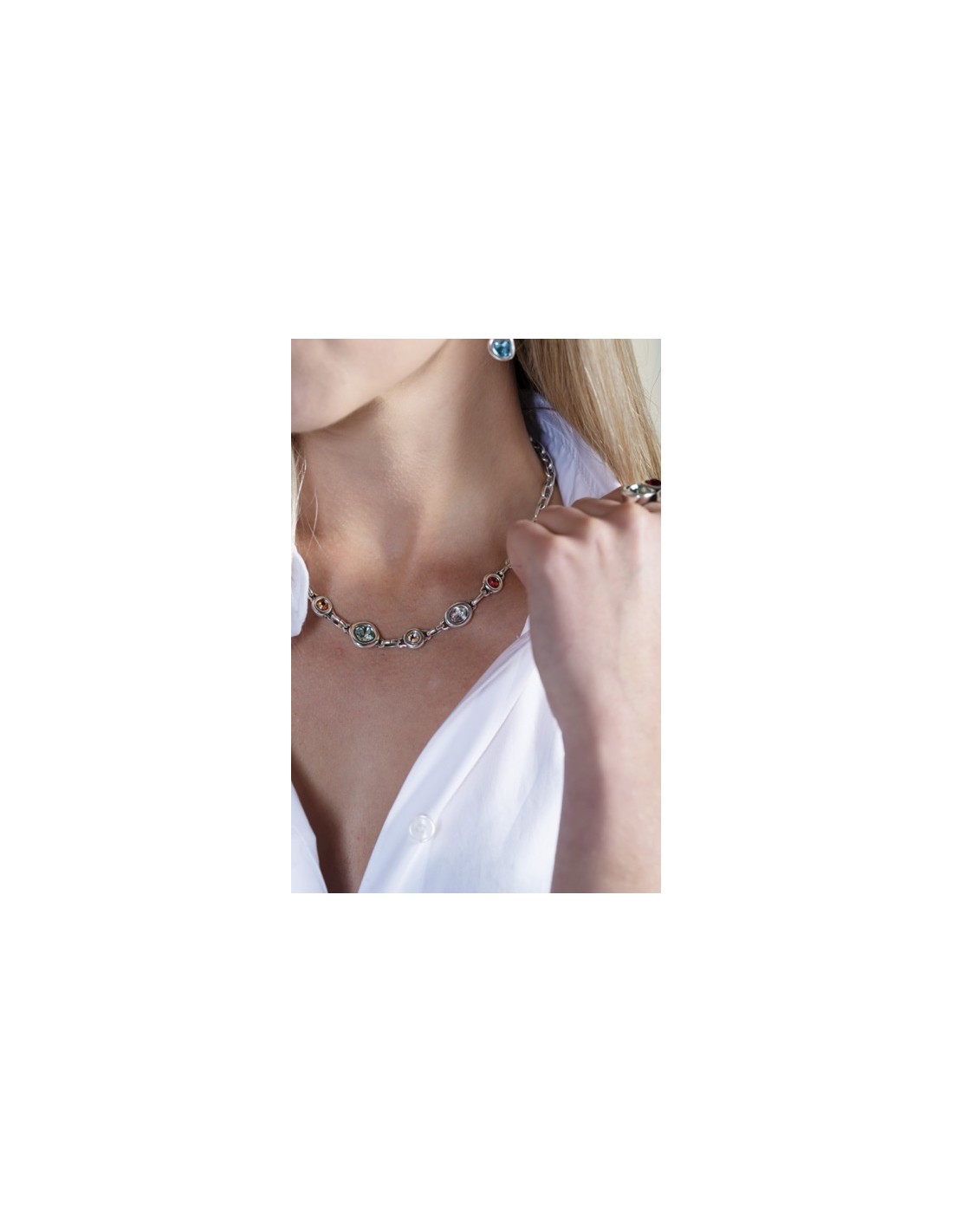 Collier Mosaico est un collier artisanal baigné d’argent, doté de motifs le long de la chaîne et de pierres facettées en deux tons. Réglable et lumineux, conçu à Madrid, il apporte une brillance expressive et contemporaine.