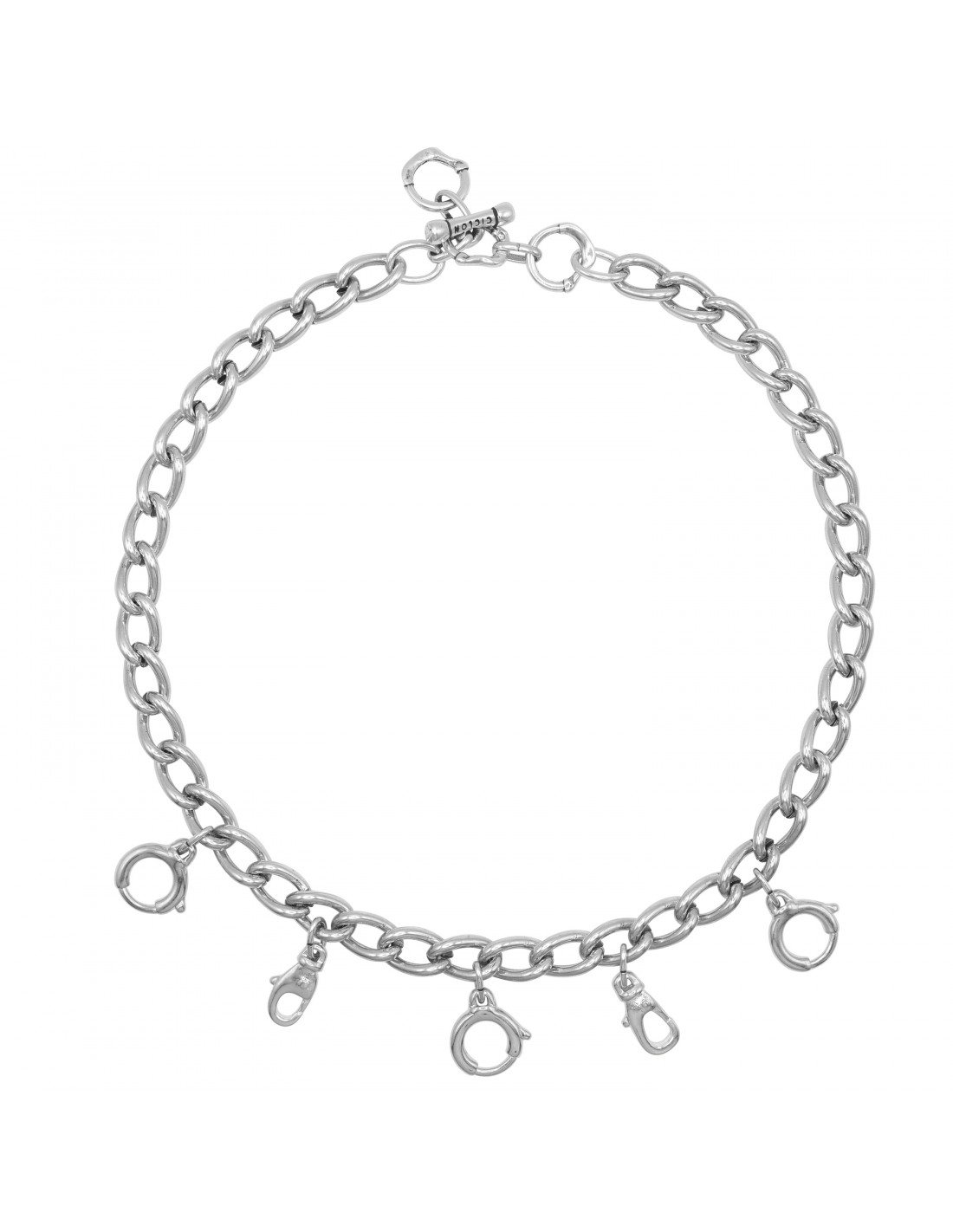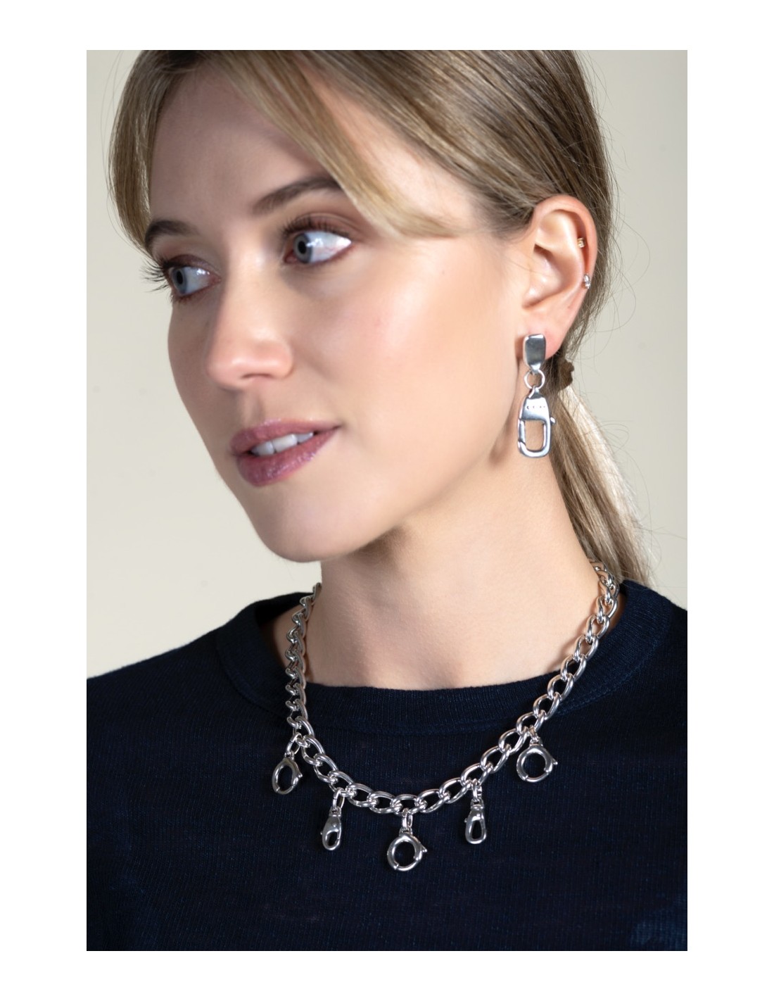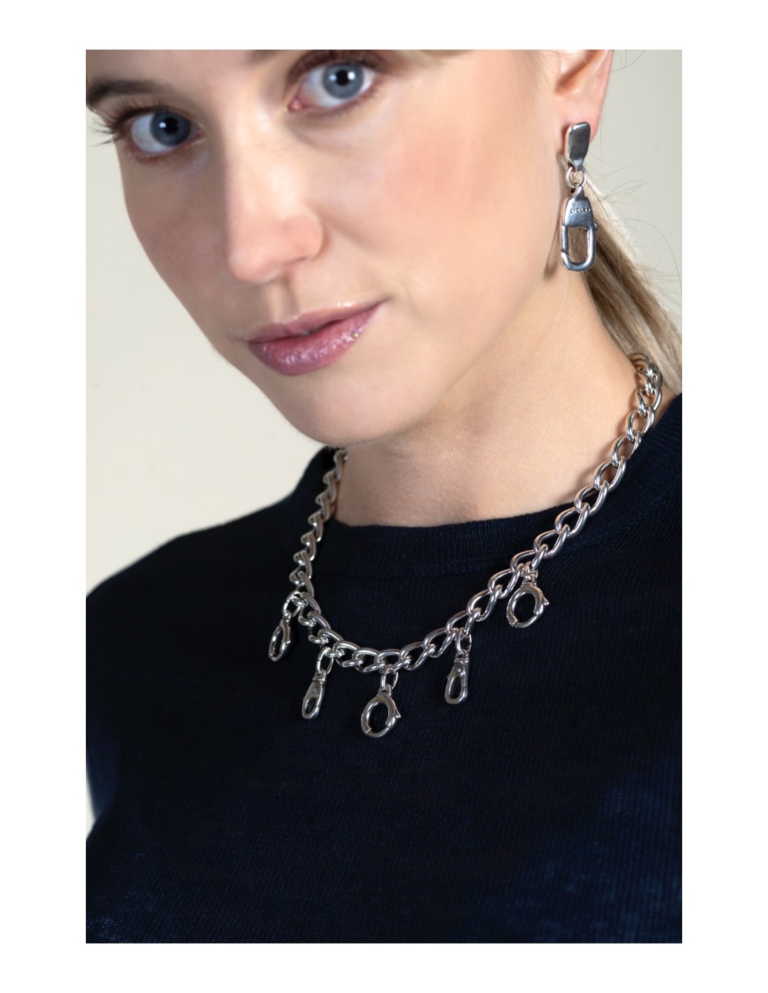 Collier Cho Oyu court avec charms mousqueton et chaîne large. Bijou artisanal en placage argent, fabriqué à Madrid, avec fermoir en forme de T et longueur ajustable.