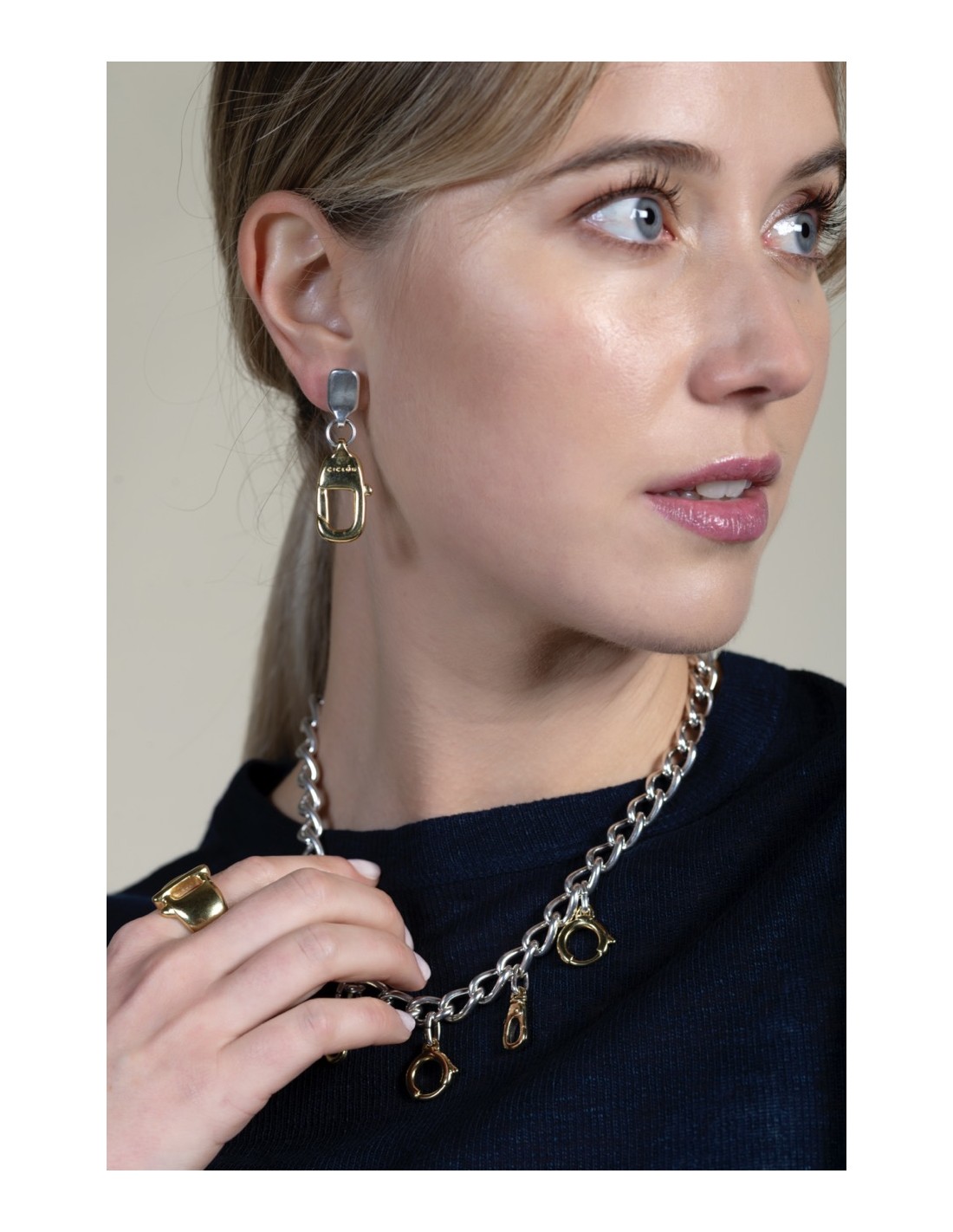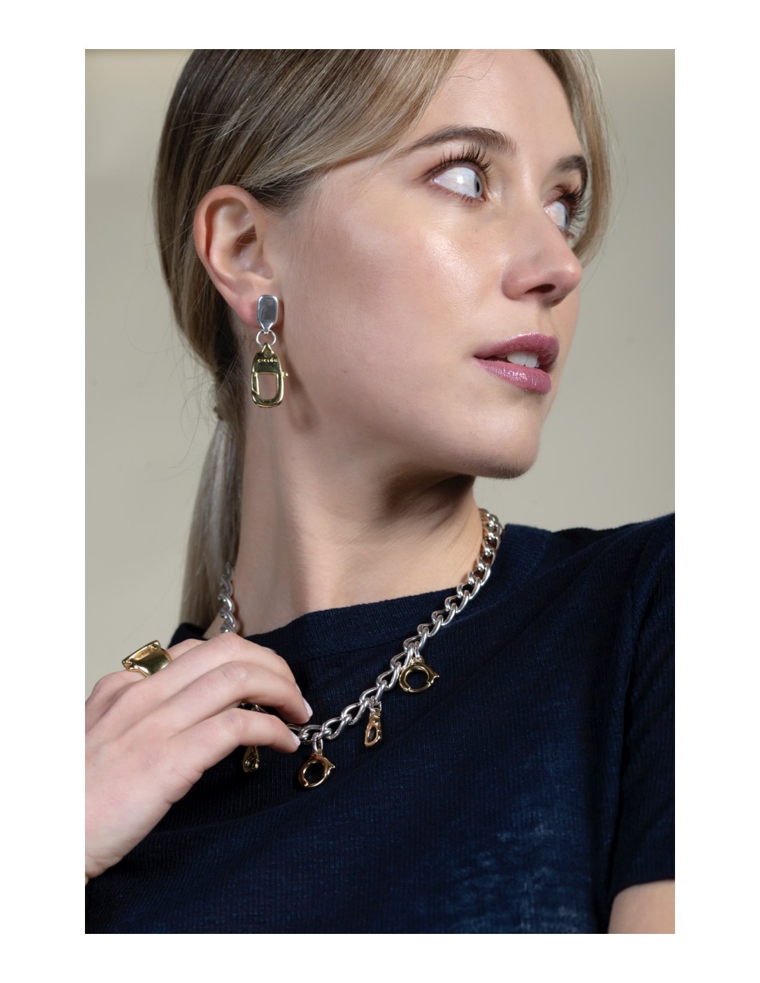 Ils réinterprètent le motif du mousqueton dans une version pendante qui apporte mouvement et légèreté. Le contraste entre le placage argent et or crée un jeu de reflets subtil et élégant. Fabriqués artisanalement à Madrid, ils associent design contemporain et caractère urbain. Le fermoir à pression assure un maintien confortable et discret. Un bijou pensé pour accompagner chaque geste avec personnalité.