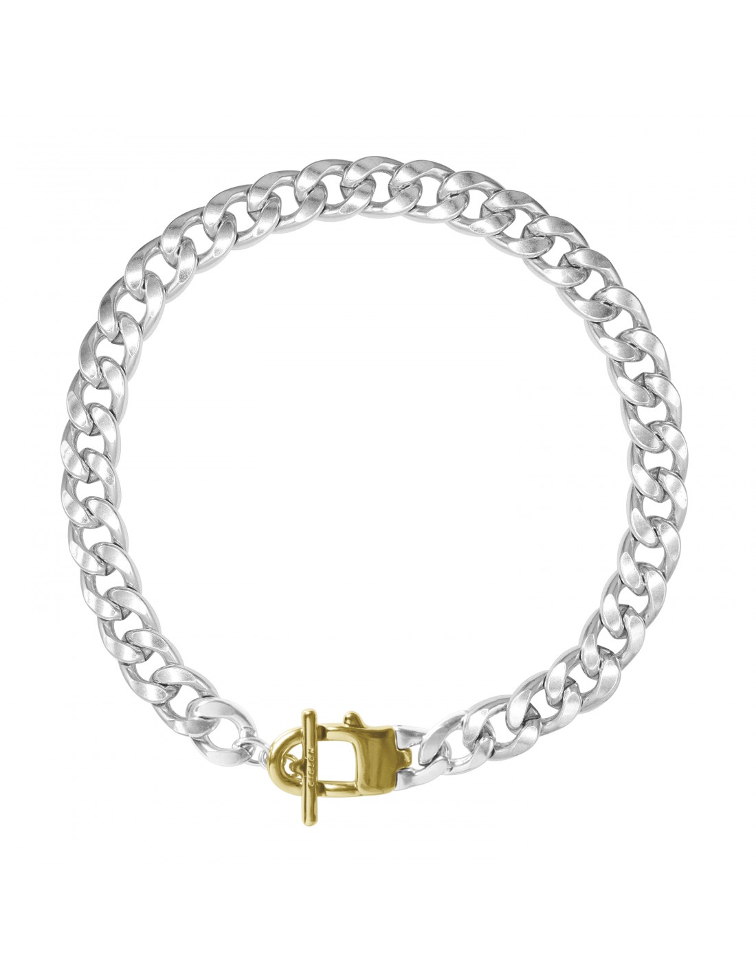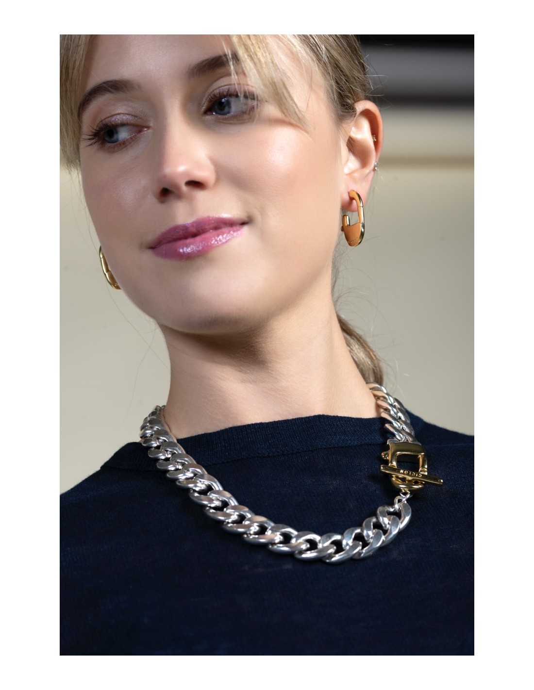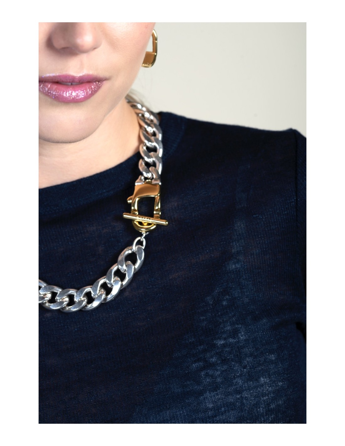 C’est un collier court à forte présence, doté d’une chaîne à larges maillons épais de 40 cm. Le motif mousqueton structure le design et renforce son caractère graphique, tandis que le contraste entre le placage argent et or apporte profondeur et éclat. Fabriqué artisanalement à Madrid et muni d’un fermoir mousqueton, il est pensé pour être porté comme pièce maîtresse et exprimer un style affirmé.