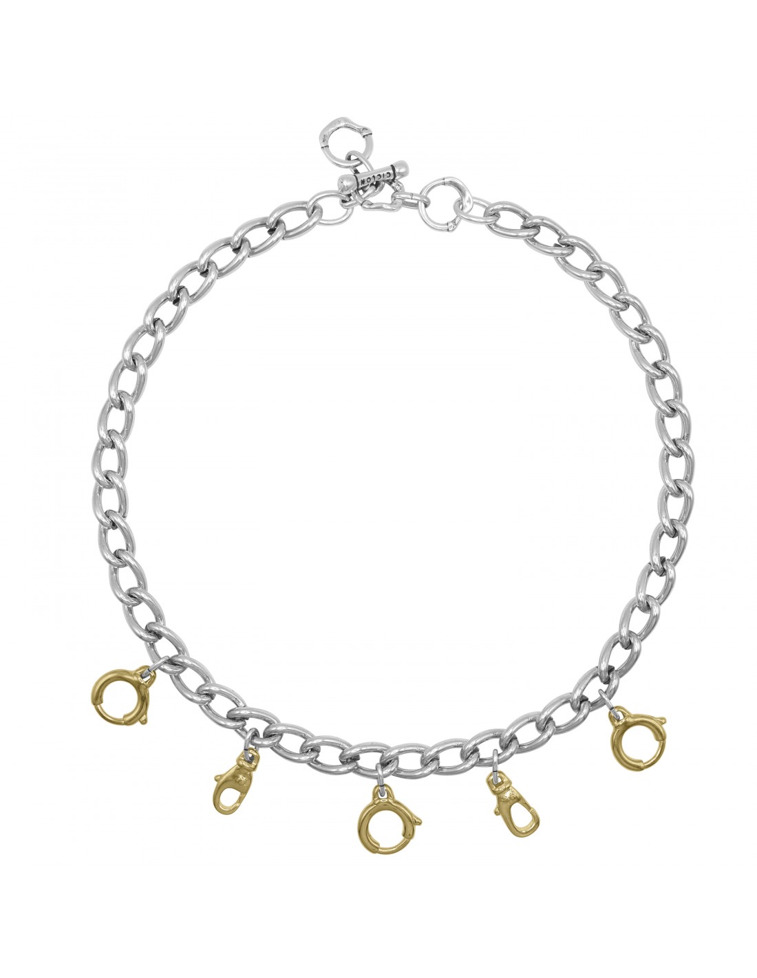 Collier Cho Oyu Gold court avec charms mousqueton et chaîne large. Bijou artisanal en placage argent, fabriqué à Madrid, avec fermoir en forme de T et longueur ajustable.