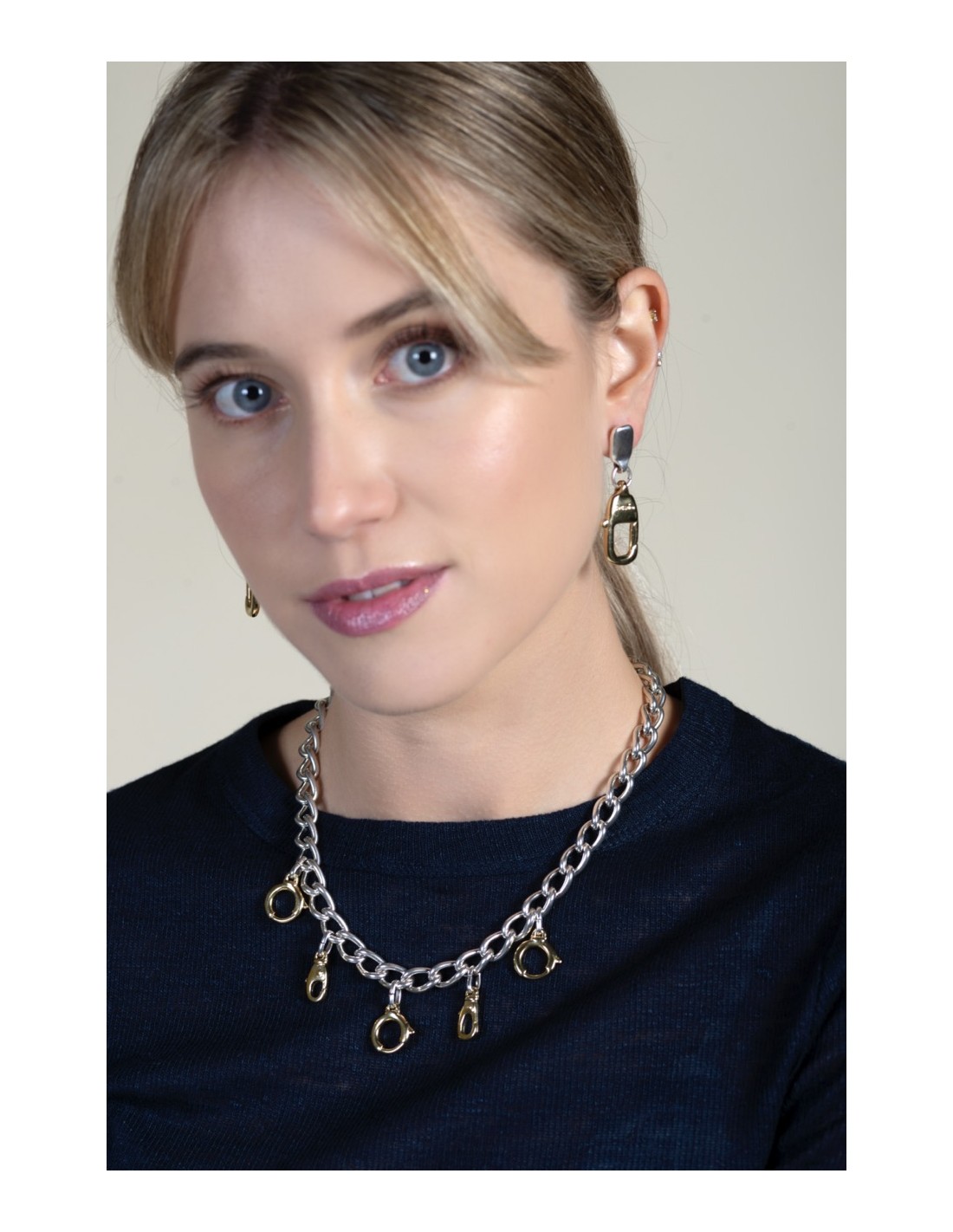 C’est un collier court avec une chaîne large d’épaisseur moyenne et des charms pendants à motif mousqueton qui apportent rythme et mouvement. Son placage argent crée de doux reflets qui accompagnent chaque geste. Fabriqué artisanalement à Madrid, il mesure de 40 à 43 cm et est doté d’un fermoir en forme de T, intégré au design. Un bijou expressif, pensé pour être porté comme pièce maîtresse.