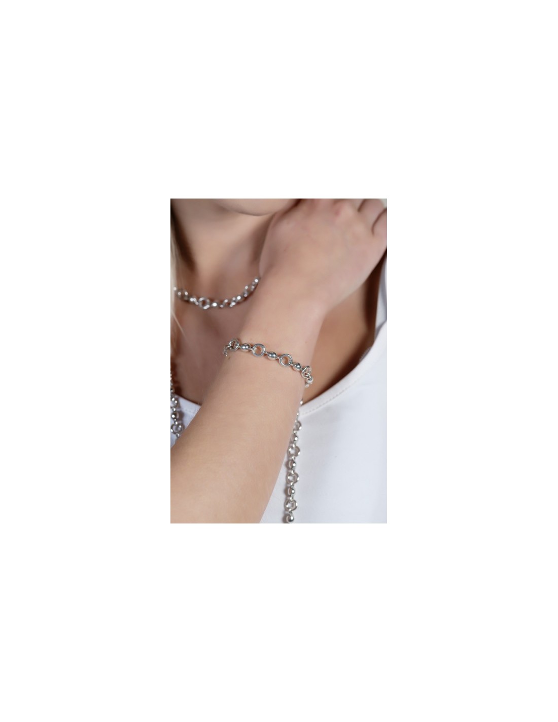 Un bracelet plaqué argent composé d’une chaîne de maillons circulaires reliés par une circonférence centrale, apportant harmonie et délicatesse au poignet. Son éclat subtil met en valeur le geste avec élégance naturelle, tandis que le fermoir mousqueton assure confort et sécurité. Fabriqué artisanalement à Madrid, il se distingue par la finesse de ses finitions et sa légèreté. Ajustable de 17 à 20 cm, il complète le quotidien avec style ou devient un cadeau plein de sens.