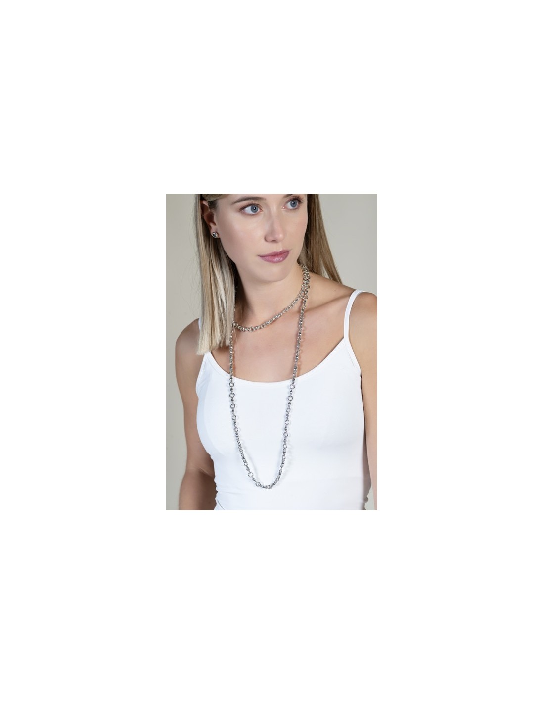Un collier long plaqué argent composé d’une chaîne de maillons circulaires reliés par une circonférence centrale, apportant mouvement et harmonie au design. Son éclat subtil met en valeur toutes les tenues avec élégance, tandis que le fermoir mousqueton assure confort et sécurité. Fabriqué artisanalement à Madrid, il se distingue par la finesse de ses finitions et sa légèreté. Ajustable de 80 à 85 cm, il se porte seul ou en superposition, ajoutant une touche moderne et sophistiquée.