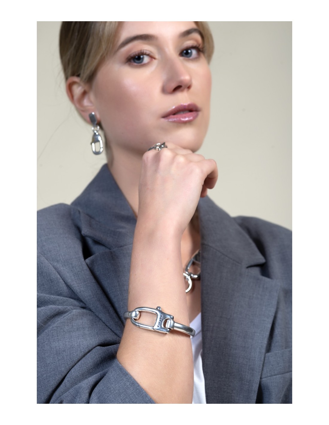 Aux lignes affirmées et à l’allure élégante, ce bracelet rigide en plaqué argent se distingue par son motif mousqueton, intégré comme fermoir et détail central. Sa finition polie reflète la lumière avec un éclat subtil, apportant caractère et équilibre à l’ensemble. Fabriqué artisanalement à Madrid, il exprime une force sereine et un style contemporain. Disponible en deux tailles, il épouse le poignet avec confort et personnalité. Un bijou pensé pour être porté au quotidien ou offert avec intention.
