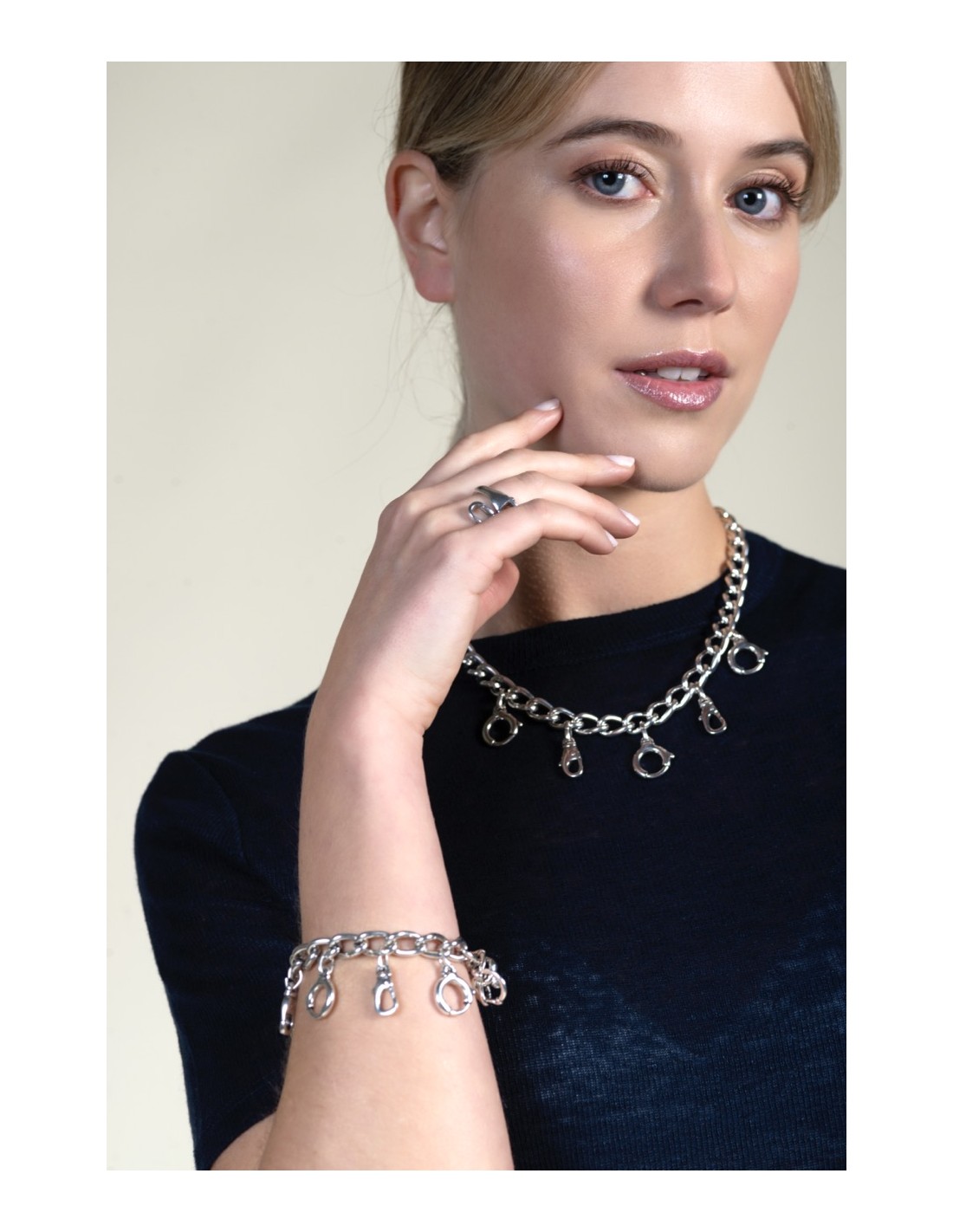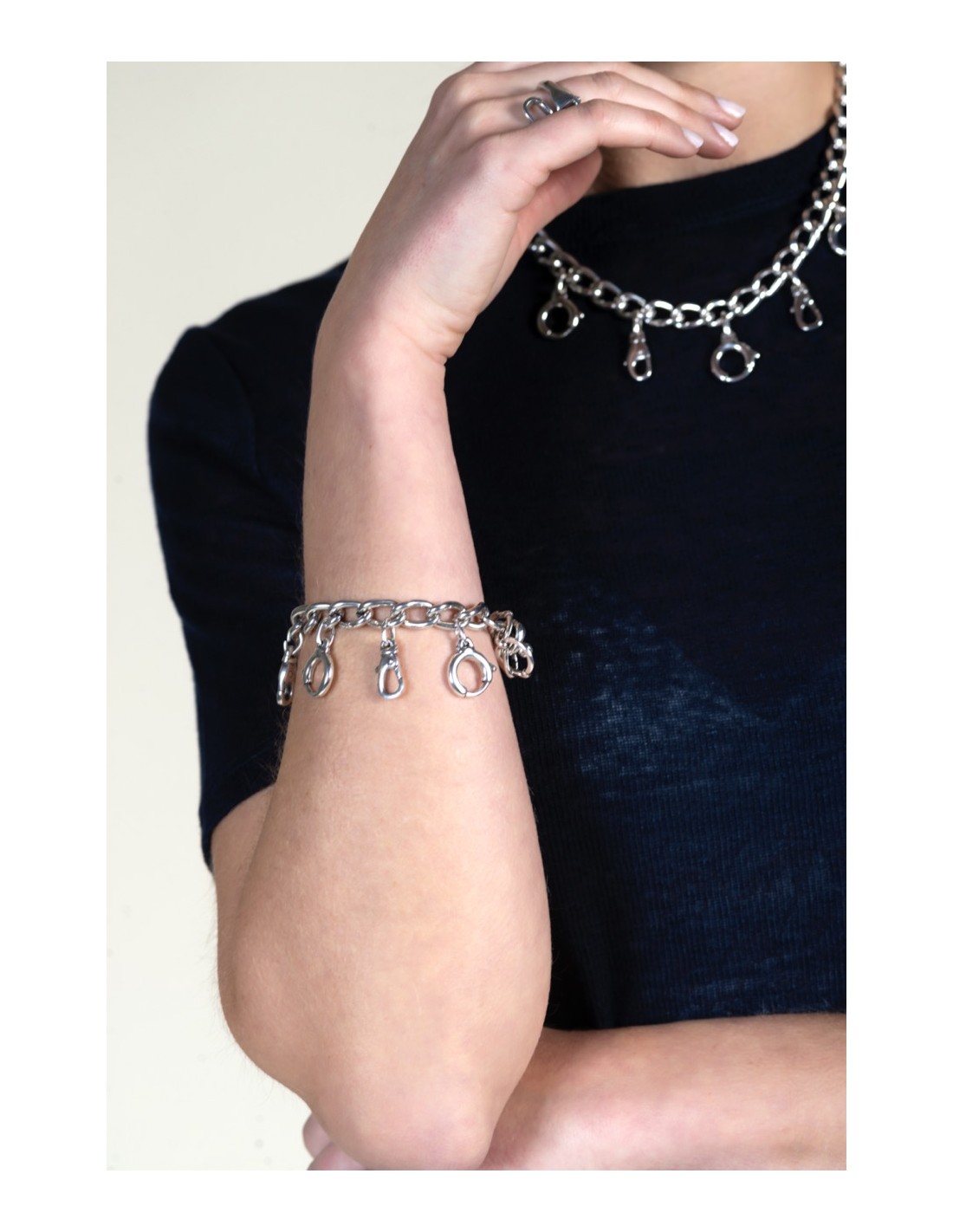 Une chaîne à maillons en plaqué argent, ornée de charms pendants en forme de mousquetons, qui apportent du mouvement et un éclat accompagnant chaque geste. Le fermoir en T complète le design avec une touche contemporaine et fonctionnelle. Fabriquée artisanalement à Madrid, sa longueur ajustable de 17 à 20 cm permet un port confortable. Un bijou expressif, pensé pour apporter caractère et rythme au style quotidien.